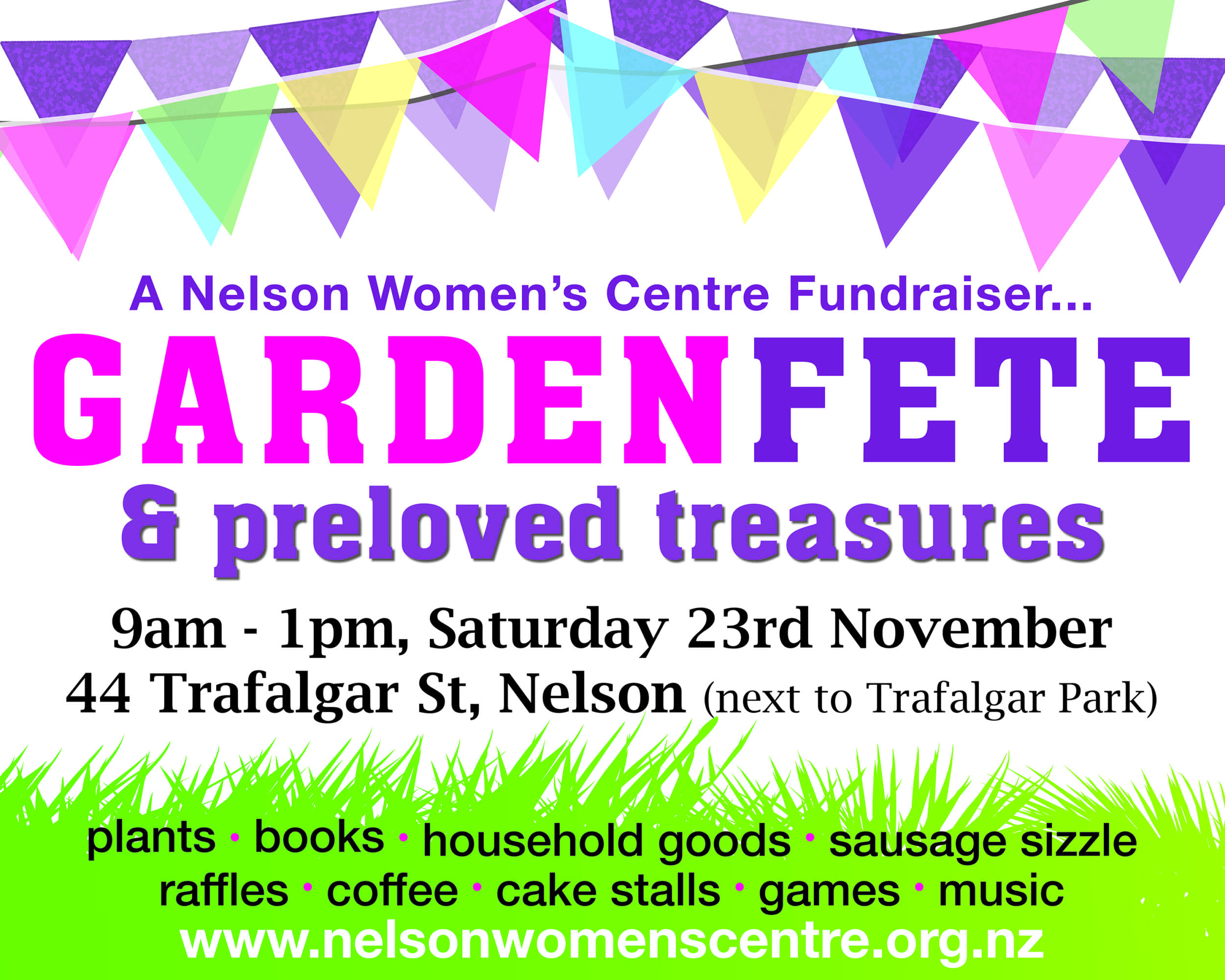 Come along to our GARDEN FETE & PRELOVED TREASURES Fundraiser for the Nelson Women’s Centre, Saturday 23rd November 9am – 1pm. PLANTS I RAFFLES I PRELOVED TREASURES I COFFEE I CAKE STALL I CLOTHING I BOOKS I GAMES + loads more… 44 Trafalgar Street (next to Trafalgar Rugby Park)