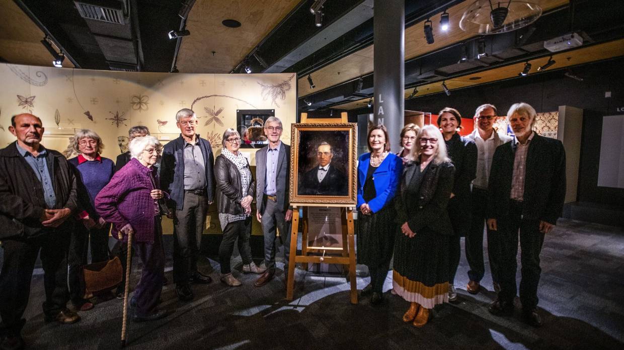 The descendants of Nelson landowner Edward Green, to the right, with family friend Peggy Jack in purple. The family donated his portrait to the Nelson Provincial Museum on Saturday.